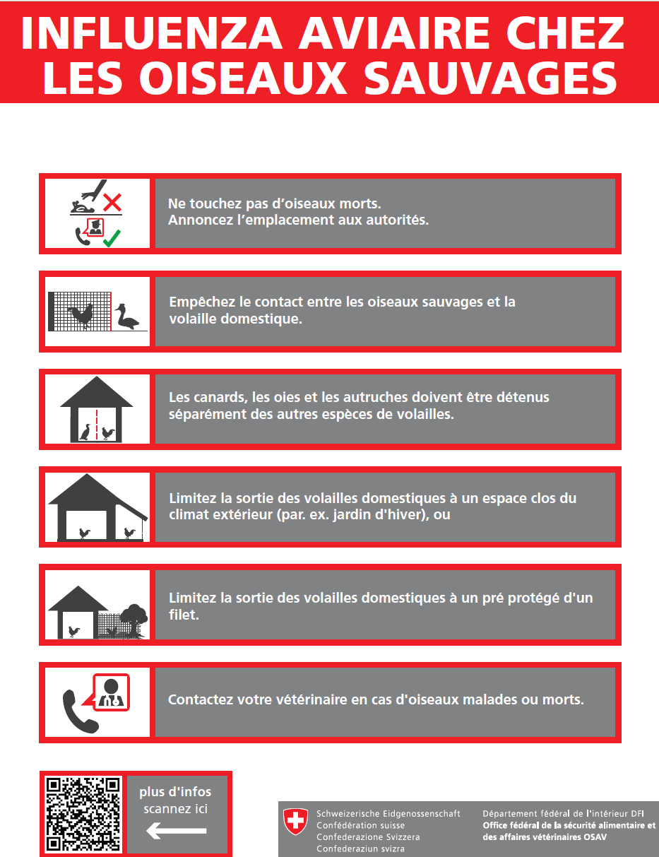 Suite à la confirmation de nouveaux cas de grippe aviaire en Suisse, l’OSAV renforce la prévention. Dès le 25 novembre 2025, l’ensemble du pays est placé en région d’observation. Les mesures sont identiques à celles déjà en vigueur dans les communes riveraines du Léman, du lac de Neuchâtel et du lac de Morat.