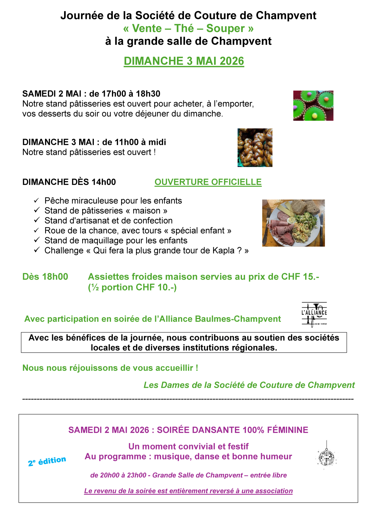 Durant le weekend, des pâtisseries, des desserts, des jeux et activités pour les enfants, la fameuse roue de la chance, les célèbres assiettes froides, la participation de la fanfare de l'Alliance Baulmes-Champvent, et un moment de partage et de convivialité.