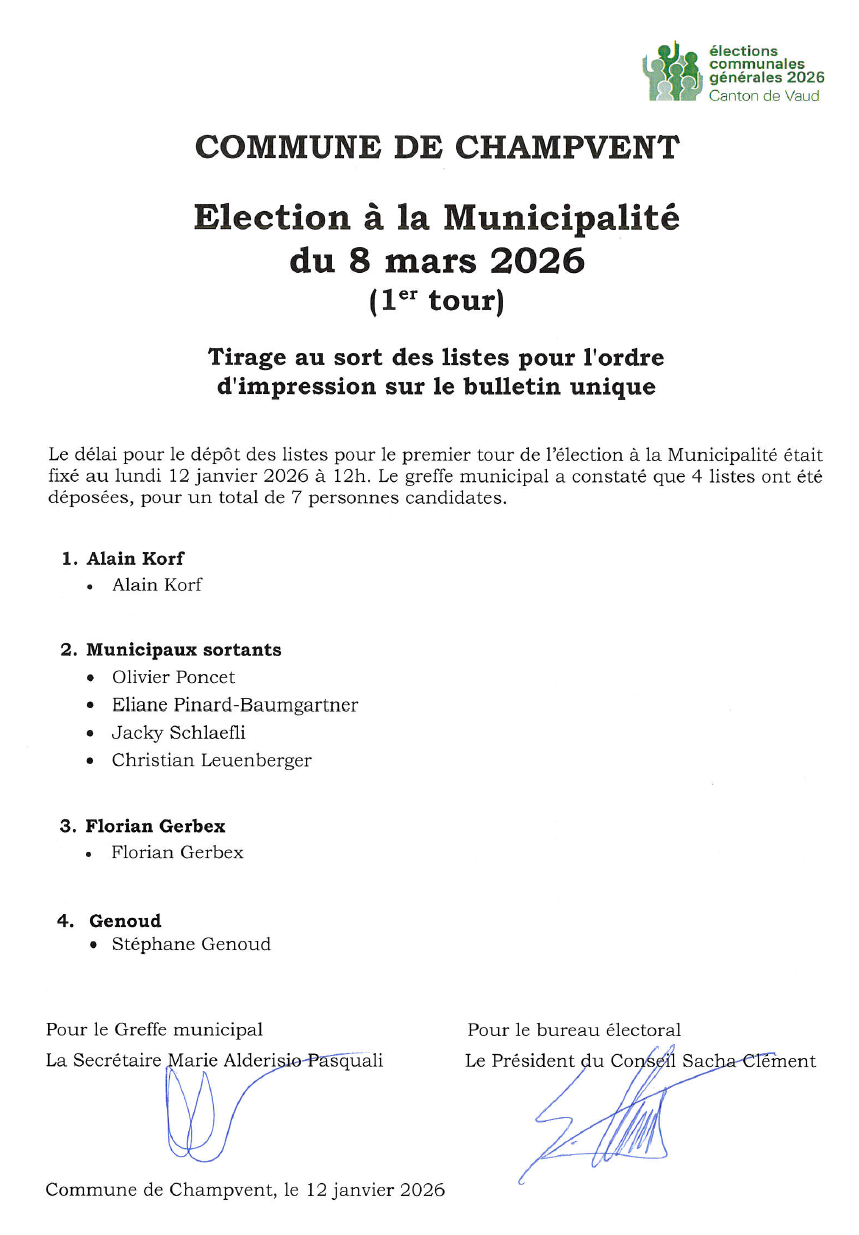 Les membres du corps électoral de le Commune de Champvent recevront leur bulletin de vote durant le mois de février. Chaque membre du corps électoral pourra voter pour cinq candidats-es.