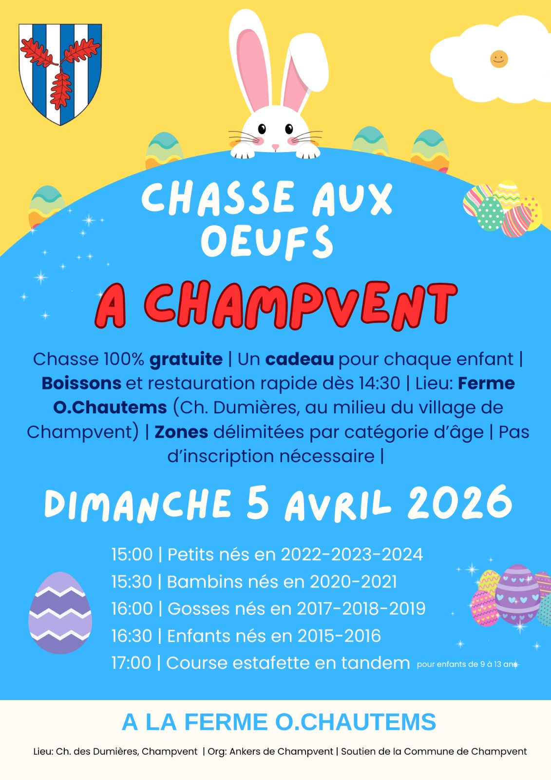 Le dimanche 5 avril 2026, venez participer à une Chasse aux oeufs villageoise. Ce sera à la ferme de la famille Chautems. Tous les détails sont ici.